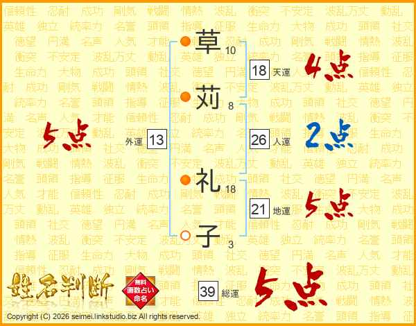 生活面を象徴する運勢です。外部から受ける影響力を表し、結婚運、家庭運や職場、環境への順応性を表します。総運から人運を引いた画数。姓や名が1文字の場合を除く。