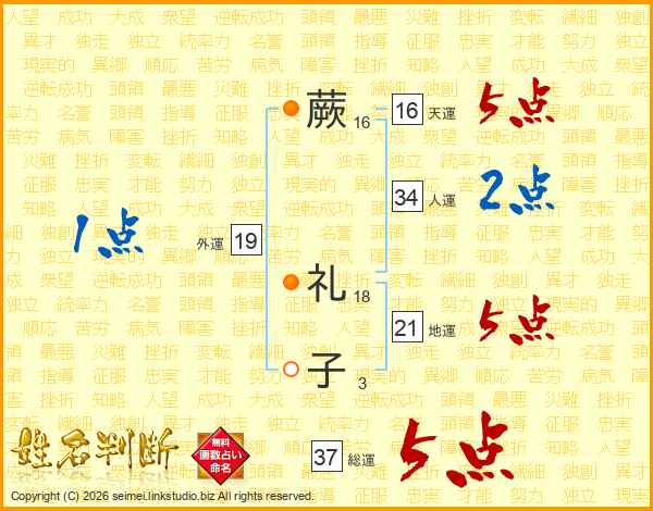 蕨礼子さんの総運は37画の5点!