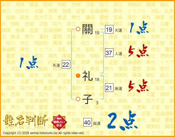 生活面を象徴する運勢です。外部から受ける影響力を表し、結婚運、家庭運や職場、環境への順応性を表します。総運から人運を引いた画数。姓や名が1文字の場合を除く。