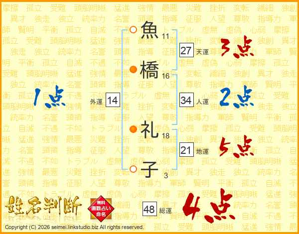 魚(11画)橋(16画) 礼(18画)子(3画)