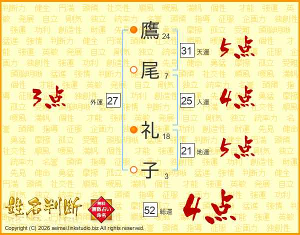 鷹(24画)尾(7画) 礼(18画)子(3画)