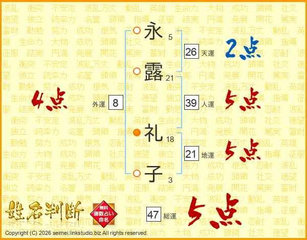 永(5画)露(21画) 礼(18画)子(3画)