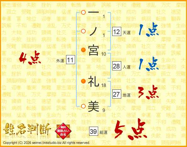 一(1画)ノ(1画)宮(10画) 礼(18画)美(9画)