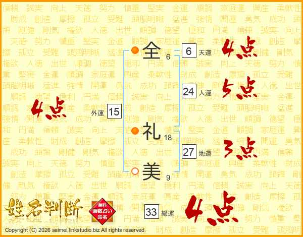 全(6画) 礼(18画)美(9画)