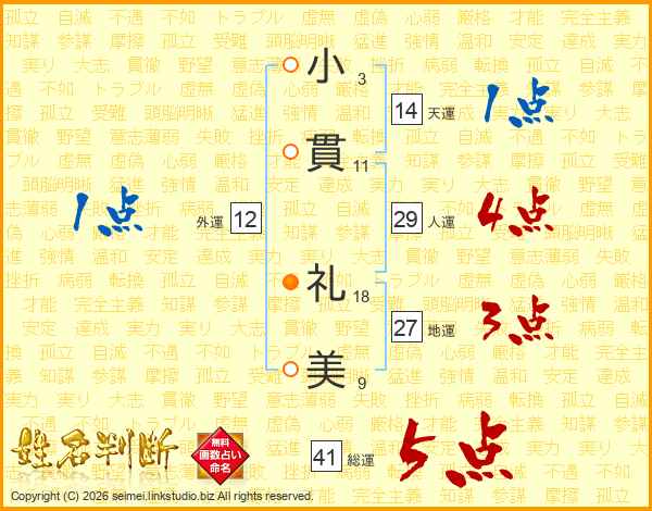 生活面を象徴する運勢です。外部から受ける影響力を表し、結婚運、家庭運や職場、環境への順応性を表します。総運から人運を引いた画数。姓や名が1文字の場合を除く。