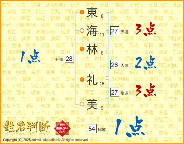 東(8画)海(11画)林(8画) 礼(18画)美(9画)