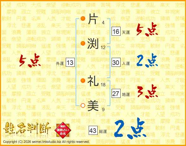 あなたの人生を表す1番重要な運勢です。生涯を通じて影響する総合運となり、主に50歳以降の晩年期に影響を及ぼします。苗字と名前の合計画数。