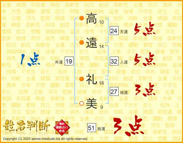 高(10画)遠(14画) 礼(18画)美(9画)
