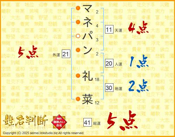 マ(2画)ネ(4画)パ(3画)ン(2画) 礼(18画)菜(12画)