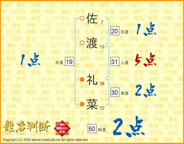 佐(7画)渡(13画) 礼(18画)菜(12画)