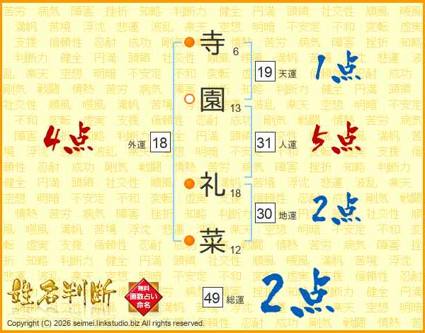 寺(6画)園(13画) 礼(18画)菜(12画)