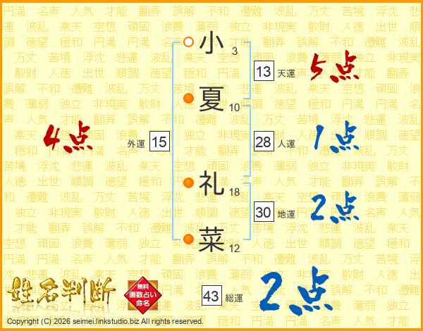 小夏礼菜さんの総運は43画の2点!