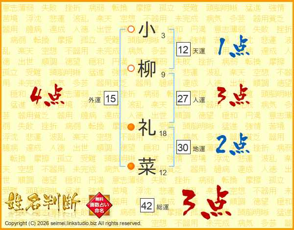 小柳礼菜さんの人運は27画の3点!