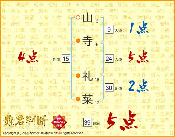 山(3画)寺(6画) 礼(18画)菜(12画)