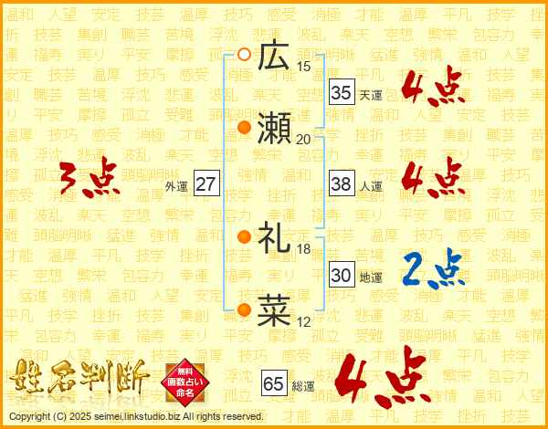 広(15画)瀬(20画) 礼(18画)菜(12画)