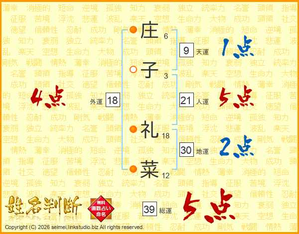 庄子礼菜さんの総運は39画の5点!