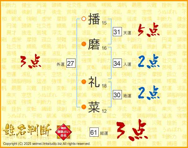 生活面を象徴する運勢です。外部から受ける影響力を表し、結婚運、家庭運や職場、環境への順応性を表します。総運から人運を引いた画数。姓や名が1文字の場合を除く。