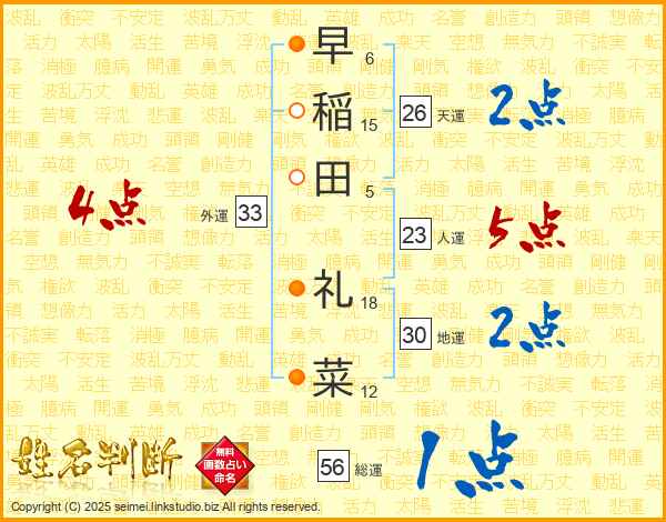 早(6画)稲(15画)田(5画) 礼(18画)菜(12画)