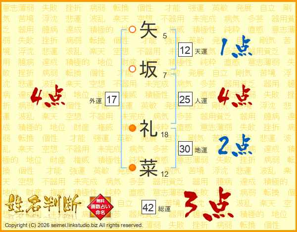 矢(5画)坂(7画) 礼(18画)菜(12画)