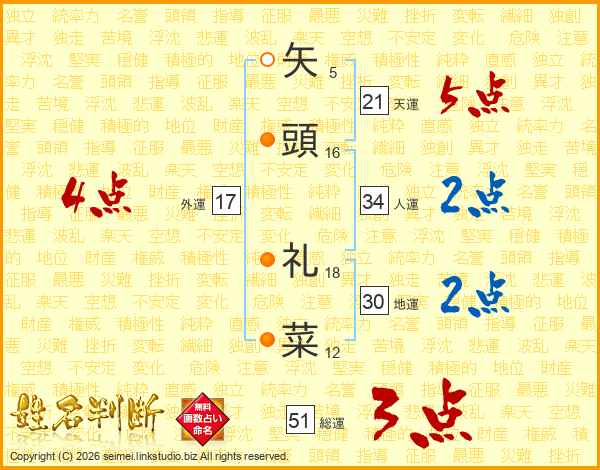 矢(5画)頭(16画) 礼(18画)菜(12画)