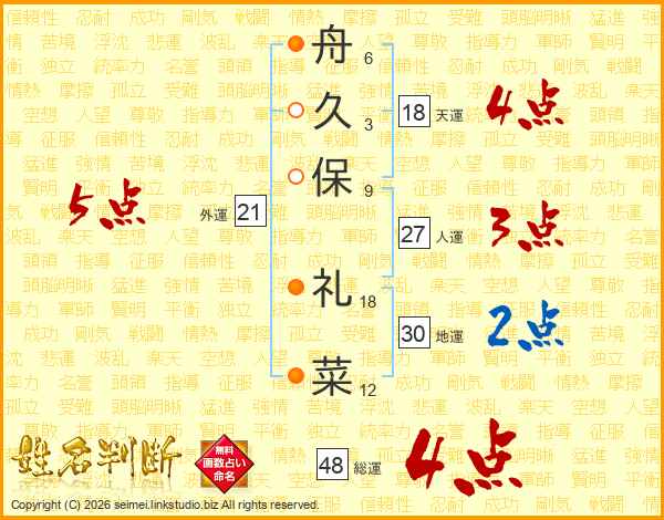 舟(6画)久(3画)保(9画) 礼(18画)菜(12画)