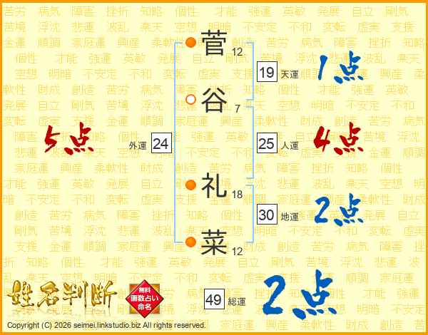 菅谷礼菜さんの総運は49画の2点!