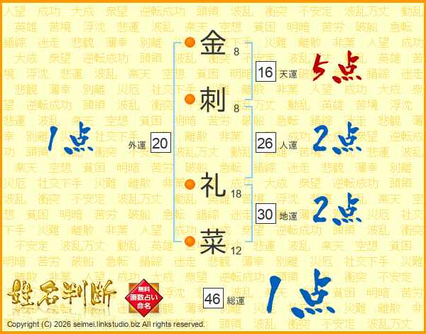 金(8画)刺(8画) 礼(18画)菜(12画)