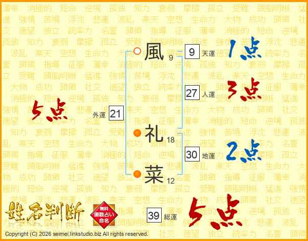 風礼菜さんの総運は39画の5点!