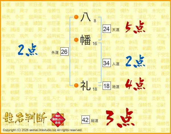 八幡礼さんの総運は42画の3点!