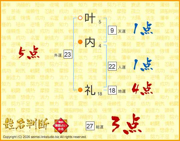 生活面を象徴する運勢です。外部から受ける影響力を表し、結婚運、家庭運や職場、環境への順応性を表します。総運から人運を引いた画数。姓や名が1文字の場合を除く。