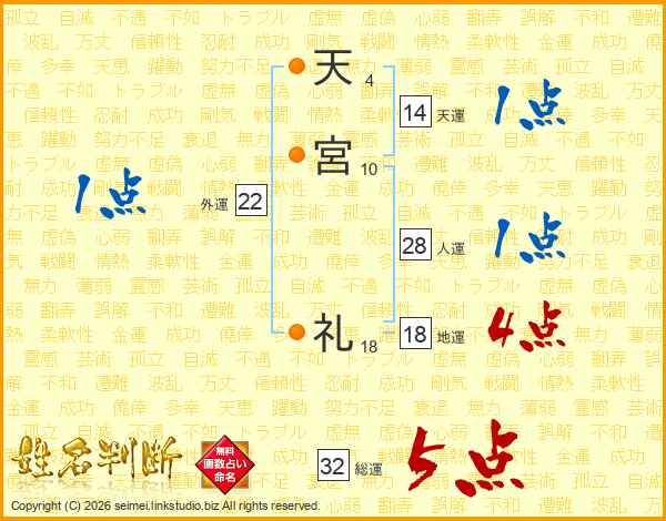 天宮礼さんの総運は32画の5点!