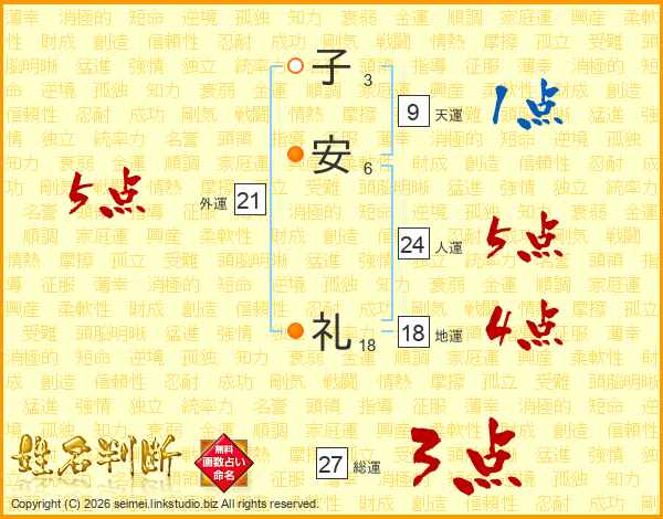 子安礼さんの総運は27画の3点!