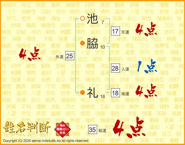生活面を象徴する運勢です。外部から受ける影響力を表し、結婚運、家庭運や職場、環境への順応性を表します。総運から人運を引いた画数。姓や名が1文字の場合を除く。