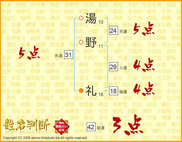 湯(13画)野(11画) 礼(18画)