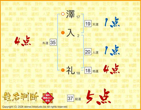 生活面を象徴する運勢です。外部から受ける影響力を表し、結婚運、家庭運や職場、環境への順応性を表します。総運から人運を引いた画数。姓や名が1文字の場合を除く。