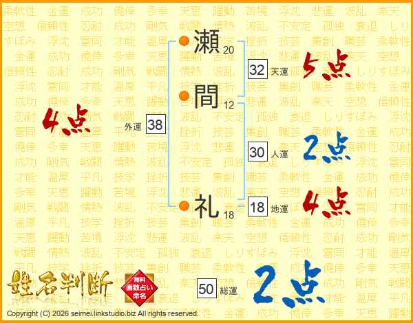 瀬間礼さんの総運は50画の2点!