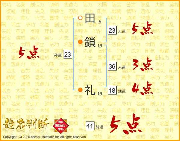 田(5画)鎖(18画) 礼(18画)