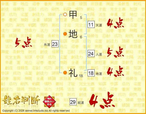 家系が持つ宿命的な運勢を表します。祖先から受け継いだ苗字ですので自分の力が及びません。家柄を象徴します。苗字の合計画数。