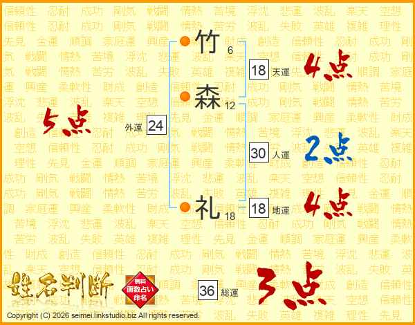 生活面を象徴する運勢です。外部から受ける影響力を表し、結婚運、家庭運や職場、環境への順応性を表します。総運から人運を引いた画数。姓や名が1文字の場合を除く。