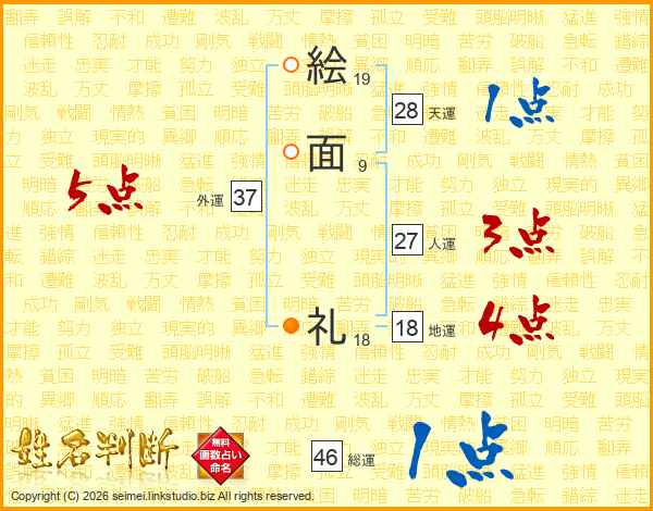 絵(19画)面(9画) 礼(18画)