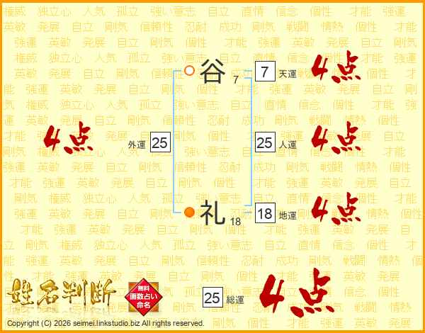 生活面を象徴する運勢です。外部から受ける影響力を表し、結婚運、家庭運や職場、環境への順応性を表します。総運から人運を引いた画数。姓や名が1文字の場合を除く。