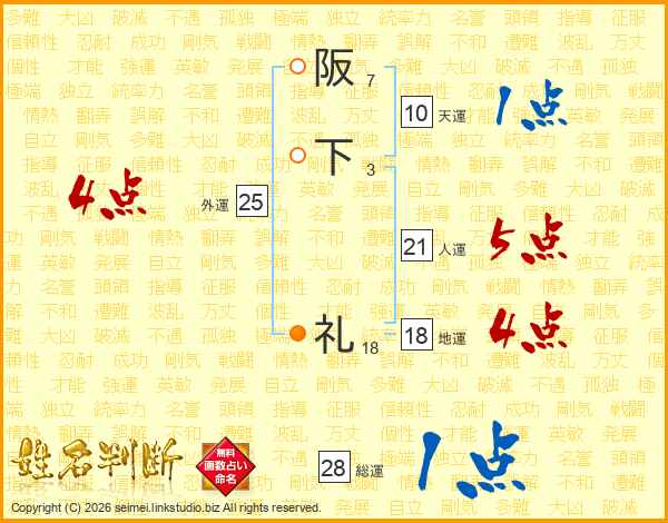 生活面を象徴する運勢です。外部から受ける影響力を表し、結婚運、家庭運や職場、環境への順応性を表します。総運から人運を引いた画数。姓や名が1文字の場合を除く。