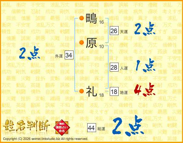 生活面を象徴する運勢です。外部から受ける影響力を表し、結婚運、家庭運や職場、環境への順応性を表します。総運から人運を引いた画数。姓や名が1文字の場合を除く。