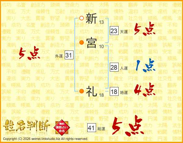 新宮礼さんの総運は41画の5点!