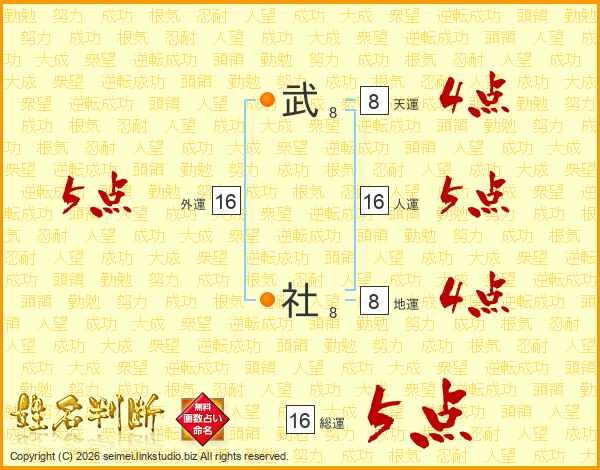 生活面を象徴する運勢です。外部から受ける影響力を表し、結婚運、家庭運や職場、環境への順応性を表します。総運から人運を引いた画数。姓や名が1文字の場合を除く。