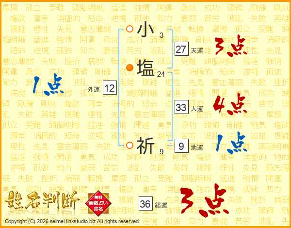 小(3画)塩(24画) 祈(9画)