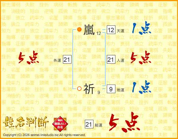 嵐祈さんの総運は21画の5点!