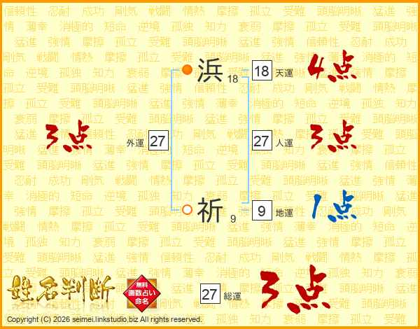 あなたの人生を表す1番重要な運勢です。生涯を通じて影響する総合運となり、主に50歳以降の晩年期に影響を及ぼします。苗字と名前の合計画数。