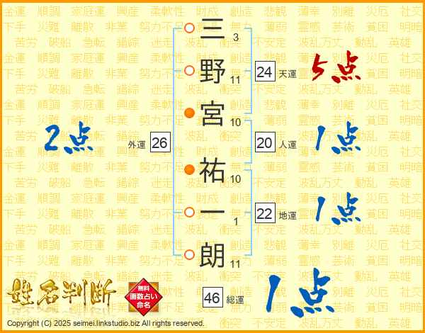 三(3画)野(11画)宮(10画) 祐(10画)一(1画)朗(11画)