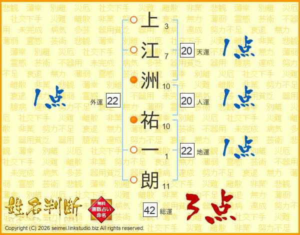 上(3画)江(7画)洲(10画) 祐(10画)一(1画)朗(11画)